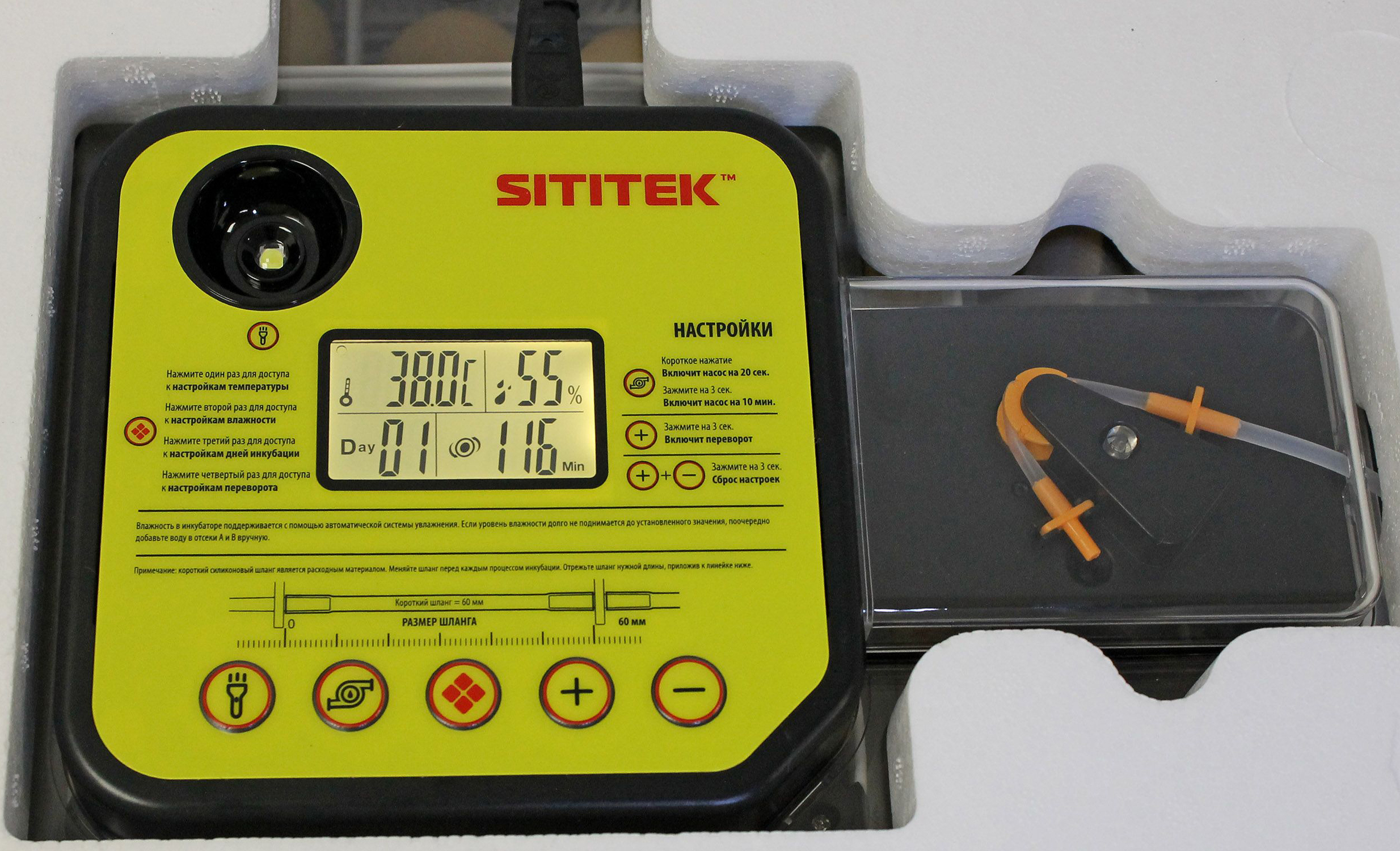 Внешняя система долива воды . Для нормальной работы водяной помпы и испарителя необходимо, чтобы по трубке в нужный момент поступало достаточное количество воды. Для этого в комплекте поставляется силиконовый шланг для воды и годовой запас дополнительных шлангов. С помощью данного шланга внутренний шланг насоса подключается к комплектной емкости с водой. Также на боковой части корпуса имеются 3 отверстия для ручного добавления воды. Стоит отметить, что инновационный полностью автоматический процесс контроля влажности расходует очень мало воды — буквально пару литров за весь период инкубации (зависит также от установленных настроек и влажности в помещении).
