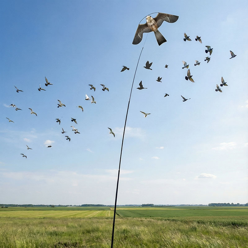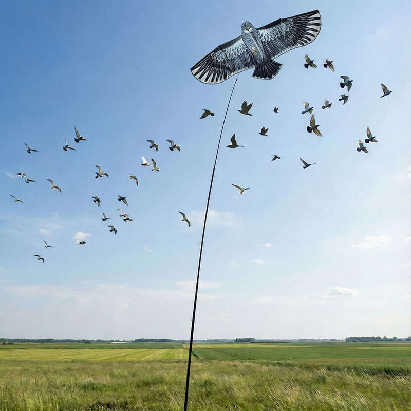 Парит в небе как крупная хищная птица, отпугивая всех пернатых вредителей своим внешним видом. Укомплектован телескопическим флагштоком для установки отпугивателя на оптимальной высоте, который поставляется вместе с металлической опорой для крепления на стену, забор или в землю. Рекомендуется использовать при скорости ветра от 3 до 20 м/с.