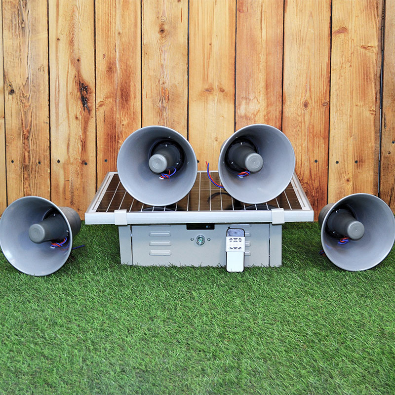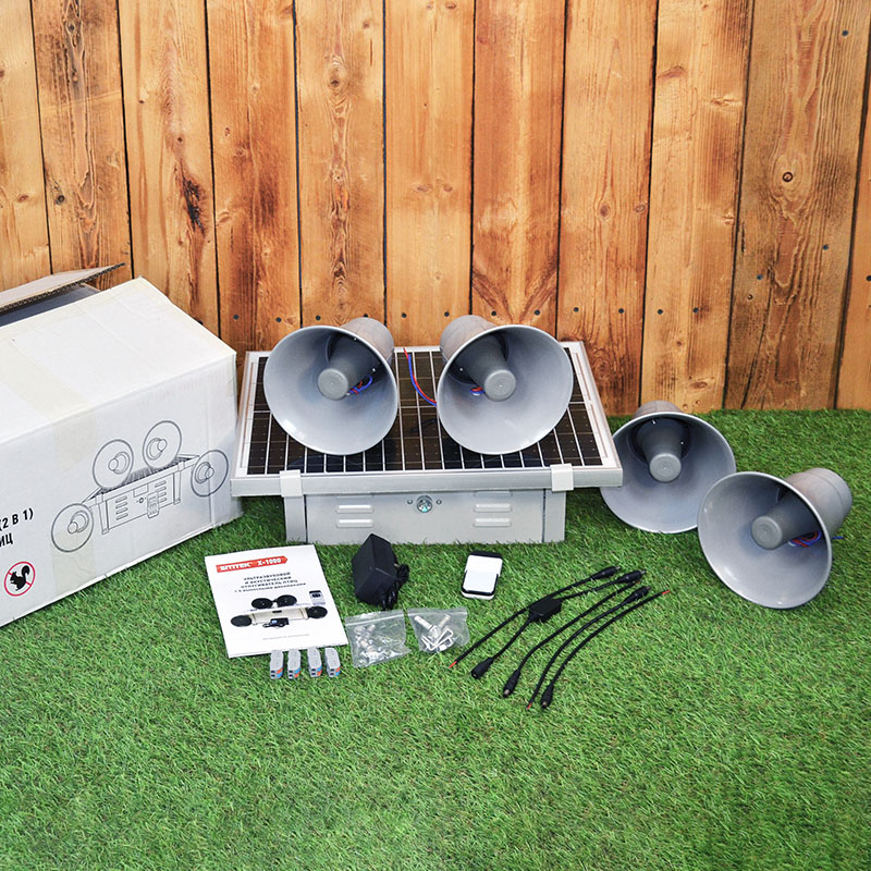 Оборудован выносным акустическим блоком кругового воздействия из 20 качественных динамиков. Комплектуется солнечной панелью и пультом ДУ, надежно защищен от осадков по стандарту IP54, поэтому идеально подходит для крупных безлюдных объектов: аэродромов, полигонов, сельскохозяйственных угодий, водоемов, ангаров.